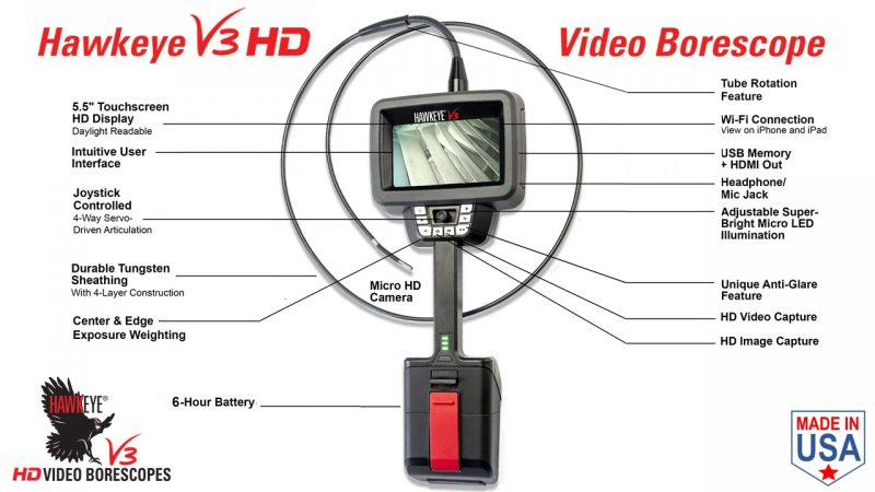 The Hawkeye® V3 Video Borescope features a new Micro HD video camera, and custom-engineered image processor. The 4- and 6-mm Hawkeye V3’s deliver simply the best image quality of any borescope on the market today! Video footage, and still images, captured by the V3 appear crystal clear and with vibrant, lifelike colors. Building on the popular Hawkeye V2 Video Borescope, which was launched in 2012, the new Hawkeye V3 incorporates significant technological advancements, and represents the next generation of video borescopes designed and manufactured by Gradient Lens Corporation. The V3 also incorporates a large, 5.5-inch HD, daylight readable, touch-screen display. The V3 easily displays, captures, and transmits over WiFi, crystal clear High-Definition (HD) video and still images, and does so using a sleek, ergonomic design, superior construction, and intuitive user interface.” The Hawkeye V3 is a valuable tool for numerous manufacturing quality control applications . . . in the QC Lab and on the shop floor. The V3 is also an essential tool for aircraft, and power generation, windpower, and engine and systems maintenance teams. The fully portable V3 provides fast, accurate diagnostics, in mission-critical situations, without the need for costly, time-consuming engine teardown. Interchangeable 90-degree and close-focus optical tips are optional. The smooth servo-driven articulation range is +/- 180 degrees. The V3 can operate continuously for 6 hours without the need for recharging. The V3 contains an integrated, high-efficiency Micro LED light source. |