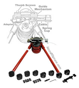 | This portable, hand-operated roll type swaging machine will swage MS type terminals onto galvanized and stainless steel cables from 1/16" diameter up to and including 3/16" dia. Includes machine, a full set of roll dies, terminal gauges and feed guide adapters and instructions in a steel carrying case. Wt. 64 lbs. New manufacture. All replacement parts available. Special order |
