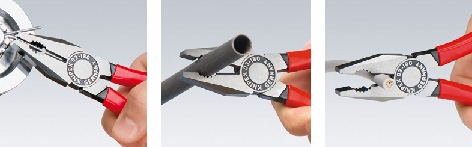 Gripping zones for flat and round material, suitable for versatile use with cutting edges for soft and hard wire. Long cutting edges for thicker cables cutting edges additionally induction hardened, cutting edge hardness approx.