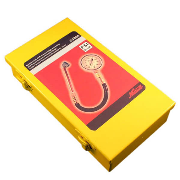 | This dual chuck stem pressure gauge assembly kit includes a flexible hose whip and metal carrying case. Pressure range of 0 - 400 PSI. |