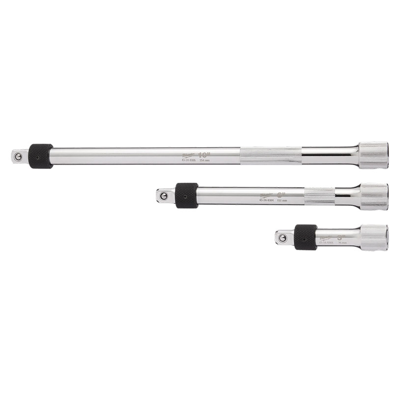 | Our 3PC 3/8" Drive Locking Extension Set offers the most control and is more secure in tight applications. These extensions feature the largest knurling surface on both the shaft and female drive end allowing precision control when hand-tightening fasteners or working with oily materials. In addition to keeping the socket secure with a durable knurled locking collar, these extensions feature a detent hole to increase engagement with the ratchet head for better overall retention. The set includes a durable compact storage rack designed to optimize drawer space for long-term use. The chrome plating on the extensions offers corrosion and rust protection. All Milwaukee® Mechanics Hand Tools are backed by a lifetime guarantee. |