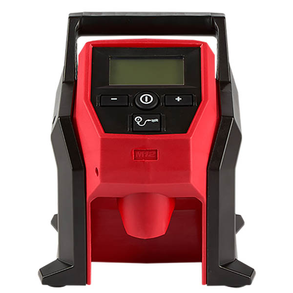 | Fastest Cordless Tire Inflator. The Milwaukee M12 Compact Inflator delivers fast, accurate, easy inflation with the portability to take anywhere. With the capability to complete demanding applications like car, LT truck, and compact equipment tires, the M12 Compact Inflator gives users ultimate power and efficiency. Rated to deliver over 120PSI, The high efficiency motor and pump top-off car tires in under 1 minute. The TrueFill Auto shut-off technology delivers highly accurate pressure, protects from overfill, and automatically senses speed of fill to deliver precise shut-off at the desired PSI. Additionally, the unit includes a large easy to read back-lit LCD, anti-vibration feet, and 26” inch hose with an all brass Schrader chuck. |
