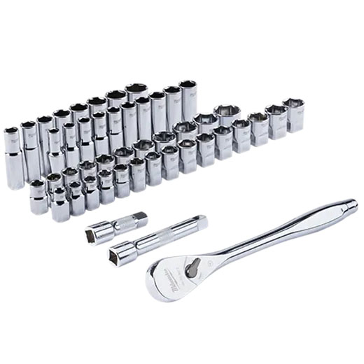 The MILWAUKEE® socket set features an innovative wrench-compatible socket design with FOUR FLAT™ sides to help prevent rolling. The ˝” drive ratchet has sockets with sizes laser engraved into the flats for easy-to-read visibility. Our optimized socket geometry additionally helps reduce bolt rounding and stripping. The Milwaukee ratchet and socket set includes a removable inner designed to be stored long-term in a steel storage chest and a durable carrying case for ultimate portability. The set's accessories guarantee you have what you need to tackle every job, both in the garage and on the jobsite. The 46 Piece SAE & Metric ˝” Drive Ratchet and Socket Set is backed by a lifetime guarantee. |