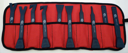PolyScrapers offer a variety of tips to suit the specific task at hand. Why use a generic sharpened “window” when you can use an advanced highly engineered tool specifically designed to remove sealant? PolyScrapers are offered in a convenient Red Canvas Pouch with black trim. The kit contains 10 Polyscrapers, each having its own pocket. Pouch can be rolled and secured with black tie.The PolyScraper Kit comes with multiple tips for various sealant removal situations. There is a forked blade, a unique push/pull design, a wide blade, a .25” narrow blade, and a straight blade. |