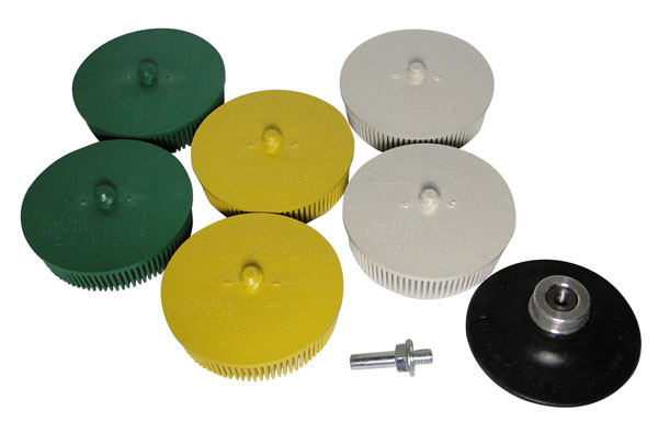 | This convenient introductory 3M™ Roloc™ Bristle Disc Kit contains 3" bristle discs in three grades: 50, 80, 120. Finer grades are recommended for light-duty applications, like finishing and polishing, and coarser grades are recommended for heavy-duty applications like grinding and deburring. A 3" Roloc TR Disc Pad Holder is also included in the pack. The disc pad optimizes performance of the bristle disc by providing a secure attachment for all applications. Plus, it saves time by eliminating the need to align edges of the disc with the disc pad — the screw aligns the disc, making disc changes quick and easy. The versatile system works with drills, disc sanders, right angle grinders and rotary sanders. |