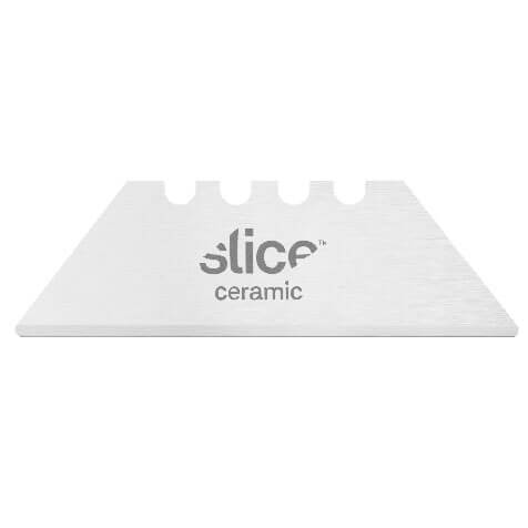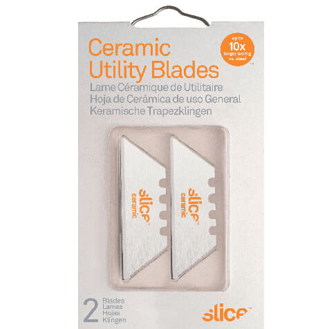 | Slice patented ceramic utility blades fits most standard utility knife handles. Each pack contains two (2) rounded-tip ceramic Slice ceramic utility blades. Each blade measures approximately 63 x 19 x 0.8 mm and weights 3 gm (2.5 x 0.75 x 0.3 in - 0.1 oz). |