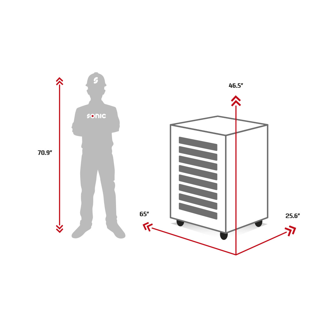 | The Sonic NEXT S15 toolbox is our flagship and the ideal choice for mechanics looking for and advanced toolset while maintaining ample additional storage space. The S15 toolbox stands at 118cm height, featuring stylish molded plastic bumpers, integrated side pockets, two spray can holders and a paper roll holder. This toolbox is our largest roll around box in the range. At 65 inches wide and 26 inches in depth, the NEXT S15 toolbox is the ultimate storage solution on wheels. |