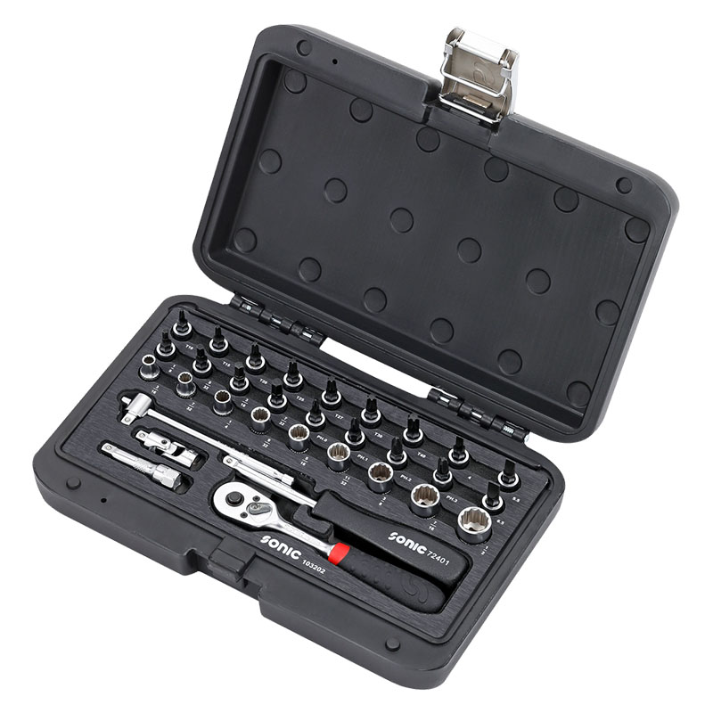 Take your tools with you with this Sonic mobile case set. Includes sockets from 3/16"-1/2" as well as the ratchet, extension, u-joint and more. Sonic ratchets and sockets are made from Chrome Vanadium steel for durability and resistance to rust and corrosion. This MCS combination 1/4" socket set is equipped with 32 pieces. The blow-molded case includes laser cut and chemical resistant foam, with every tool clearly and properly labeled. The latch system makes opening and closing the case incredibly easy. This unique mobile case set takes organization and efficiency to a new level |