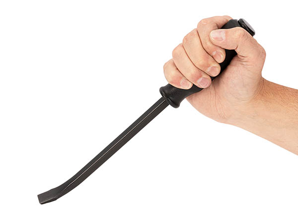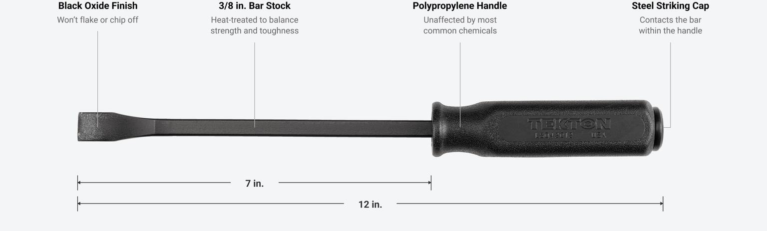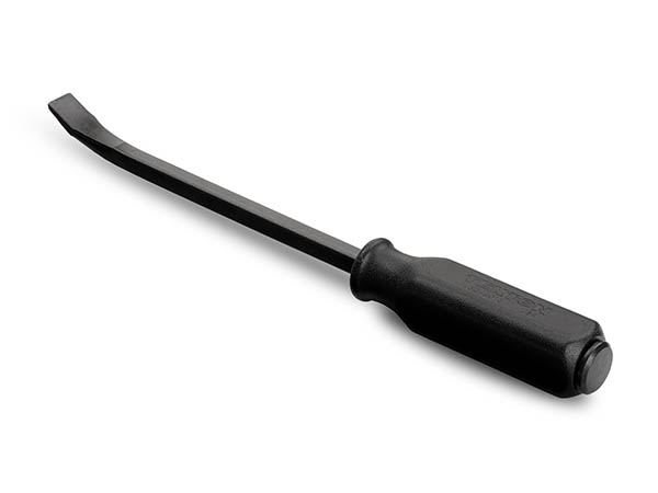 | 12 Inch Angled End Handled Pry Bar Materials and Construction  Angled for Prying and Positioning Slide in between materials or under objects with the pry bar's chisel tip, then use the angled end of the bar as a fulcrum to push apart or lift up the workpiece.  Steel Striking Cap Contacts Bar The 1-inch diameter solid steel striking cap is designed to be struck by a hammer. The end of the cap directly contacts the bar stock so that any force you apply is effectively transferred through the tool.  Extremely Durable Handle The large, polypropylene handle is impact-resistant and unaffected by most fuel, solvents, and common chemicals. It’s lightly textured to provide your hands extra grip when working.   |