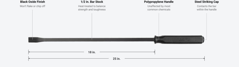 Materials and Construction ![]() Angled for Prying and Positioning Slide in between materials or under objects with the pry bar's chisel tip, then use the angled end of the bar as a fulcrum to push apart or lift up the workpiece. ![]() Steel Striking Cap Contacts Bar The 1-inch diameter solid steel striking cap is designed to be struck by a hammer. The end of the cap directly contacts the bar stock so that any force you apply is effectively transferred through the tool. ![]() Extremely Durable Handle The large, polypropylene handle is impact-resistant and unaffected by most fuel, solvents, and common chemicals. It’s lightly textured to provide your hands extra grip when working. ![]() ![]() |