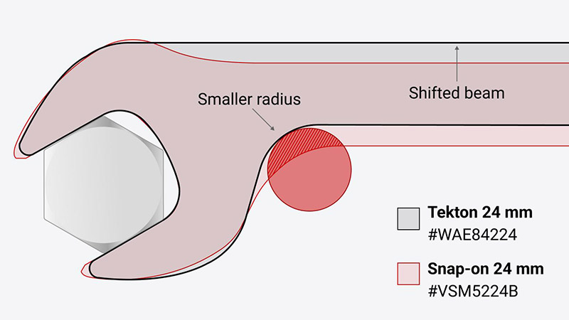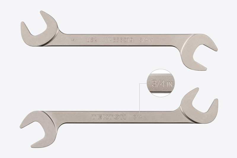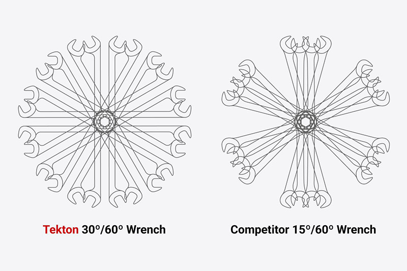 Unmatched Access Upgrade your capability to work around obstructions. With angled heads that allow you to progressively turn fasteners and fittings in confined spaces, Tekton's 30°/60° angle head wrenches save you time because you can continue work without disconnecting or dismantling equipment to access hard-to-reach areas. ![]() Best Combination of Angles We paired 30 and 60 degree angled heads to achieve greater coverage with fewer blind spots in limited access situations. ![]() Part of a System of Access Wrenches Tekton angle head wrenches have a 30-degree angled head on one side and a 60-degree angled head on the other for greater coverage with fewer blind spots. They complement our other access wrenches, including crowfoot, flare nut crowfoot, and service wrenches. Designed to Work in Tighter Spots Than the CompetitionBeam Position Improves PerformanceTo achieve the greatest range of motion in confined spaces, we shifted the Tekton wrench beam the maximum distance up and out of the way and reduced the radius where it meets the wrench head. ![]() Optimized for Access and StrengthLeanest Head ShapeAt each point along its horizontal length, the height of the jaw is no more and no less than needed to achieve our strength specification, thus maximizing access. ![]() Prevents Jaw Spread The jaw uses the largest possible inside corner radii to reduce the concentration of stress that can lead to jaw spread. ![]() Refined DetailsMaterials and FinishWe make our angle wrenches from 4140 chromium-molybdenum steel and harden them to 50-53 HRC. The wrenches are abrasive-blasted to create a finely textured satin finish and then plated with corrosion-resistant nickel. ![]() Clear Size Markings The wrench sizes are laser engraved onto both sides of each angle wrench with a large, permanent marking that's easy to read. ![]() Chamfered Handle The edges of the wrench beam are chamfered to provide a smooth, comfortable grip for your hands. ![]() Advanced Manufacturing ProcessesElectroless Nickel PlatingThe electroless nickel plating finish is easy to wipe clean and highly resistant to corrosion. Low Environmental Impact: Electroless nickel is a low environmental impact alternative to conventional hexavalent chrome plating. It uses a chemical reaction involving nickel and phosphorus and doesn't require the use and disposal of chromium. Uniform Coverage and Better Fit The electroless process applies a uniform coating to the entire tool surface. By comparison, electroplating, including conventional chrome plating, has varying thickness across the tool because the plating thickness depends on the electric current density at each point on the tool. The uniformity of an electroless coating has two major advantages: