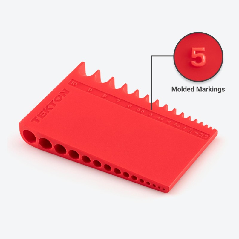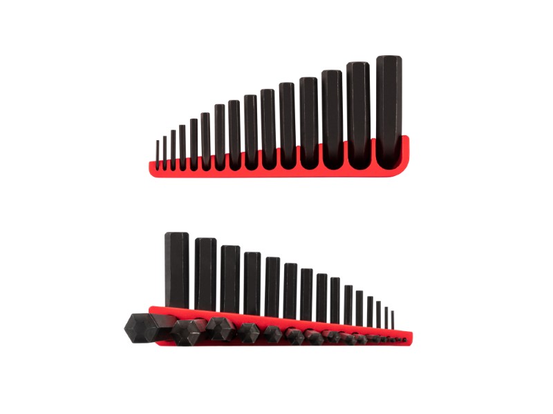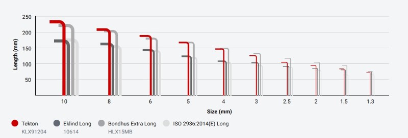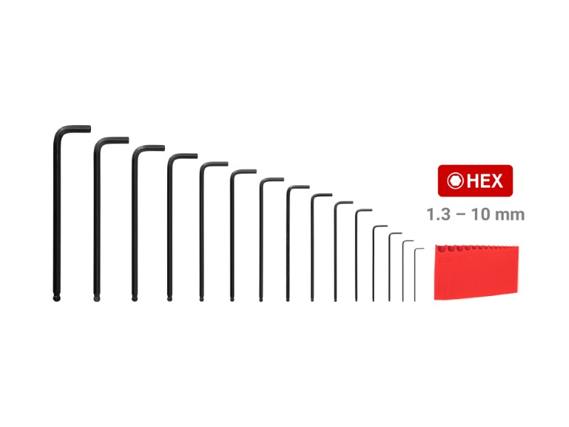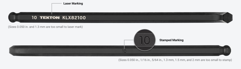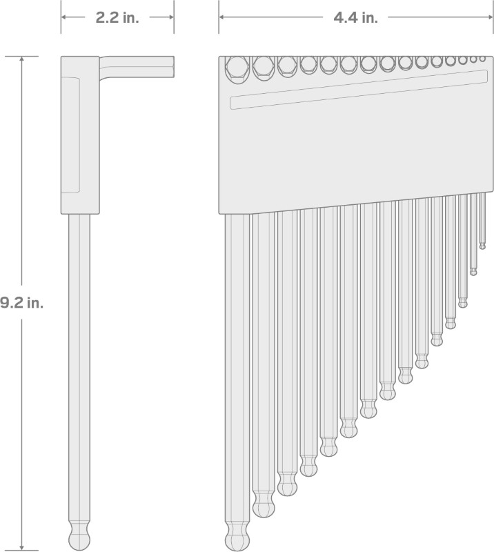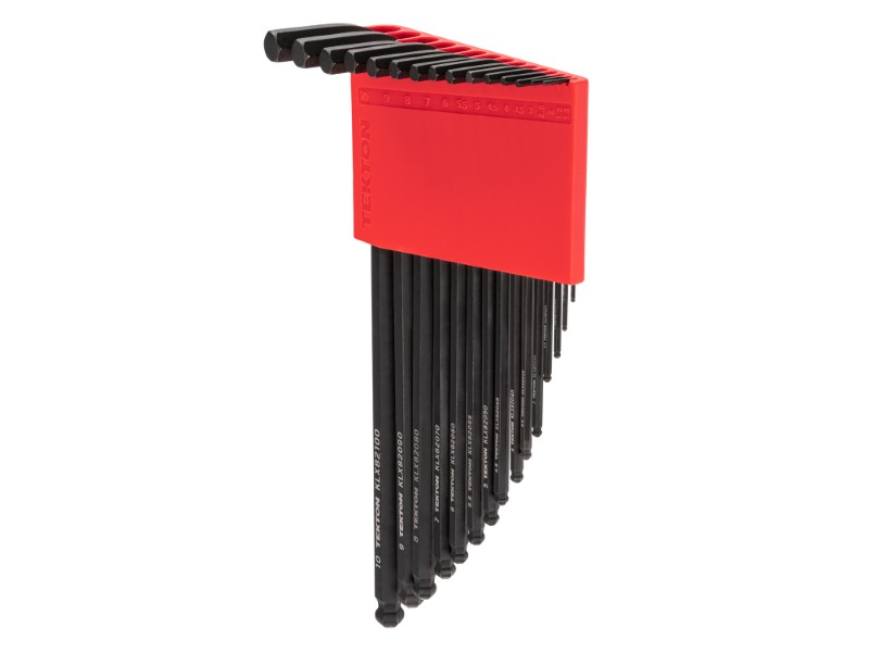 | Tekton Ball End Hex L-Key Set with Holder, 15-Piece (1.3-10 mm) High Leverage We designed the keys to be longer to increase leverage where it matters.  Tight Fit with Fasteners We precisely manufacture our hex key geometry on the large end of the applicable range, resulting in less slop in fasteners.  Two Measures of Tolerance Control We measure our hex key tolerances in two ways, from point-to-point and side-to-side, to ensure the highest standards of dimensional accuracy and consistency 20º Ball Angle Increases Access Our keys implement a steep ball end angle that increases your ability to access fasteners while still maintaining sufficient strength.  Refined Edges Tekton keys have slightly chamfered edges (except sizes that are too small to be chamfered: 1.3 mm, 1.5 mm, 2 mm, 0.050 in., 1/16 in., and 5/64 in.) and a smooth top face to optimize engagement with fasteners.  Materials and FinishesMaximum Torque Strength We make our L-keys with 8660 nickel chromium molybdenum steel that's heat-treated to 54-58 HRC to produce tools that are hard, but not brittle. As a result, the maximum torque of the L-keys consistently exceeds the ASME standards for minimum torsion load and the ISO standards for minimum proof torque.  Corrosion-Resistant Finish We coat all of our keys with a durable manganese phosphate finish that’s resistant to corrosion.  Clear Markings With the exception of the smallest sizes, Tekton L-key sizes are marked in two ways—both with a high-visibility laser marking and a stamped marking.  Orginization FeaturesQuick Access We designed the holder to organize the L-keys facing forward so you can easily access each tool without having to move others out of the way.  Low-Profile Organization You can also face the L-keys to the side for a flat, low-profile organization solution.  Self-Aligning Key Slots The slots are uniquely shaped to guide the head of each L-key into alignment with the others. Durable Material The holder provides a firm, flexible grip and resists cracking or breaking.  |
