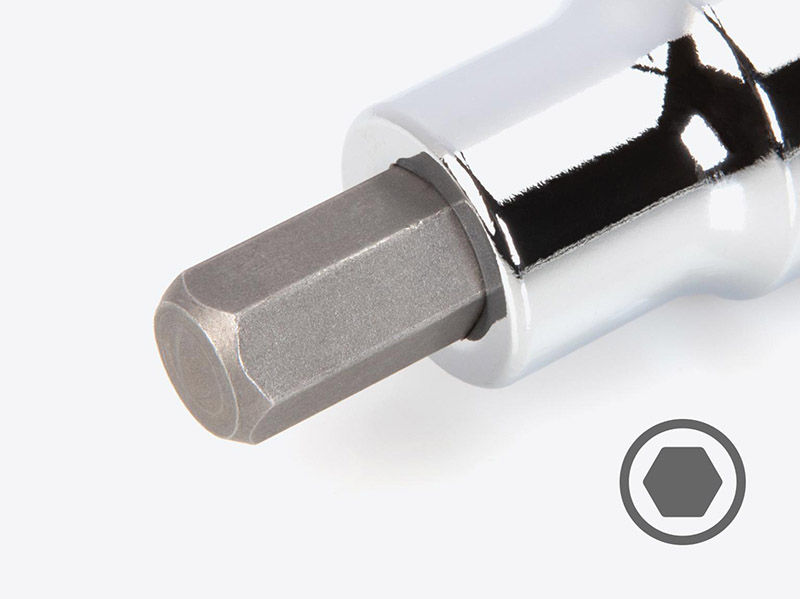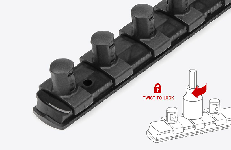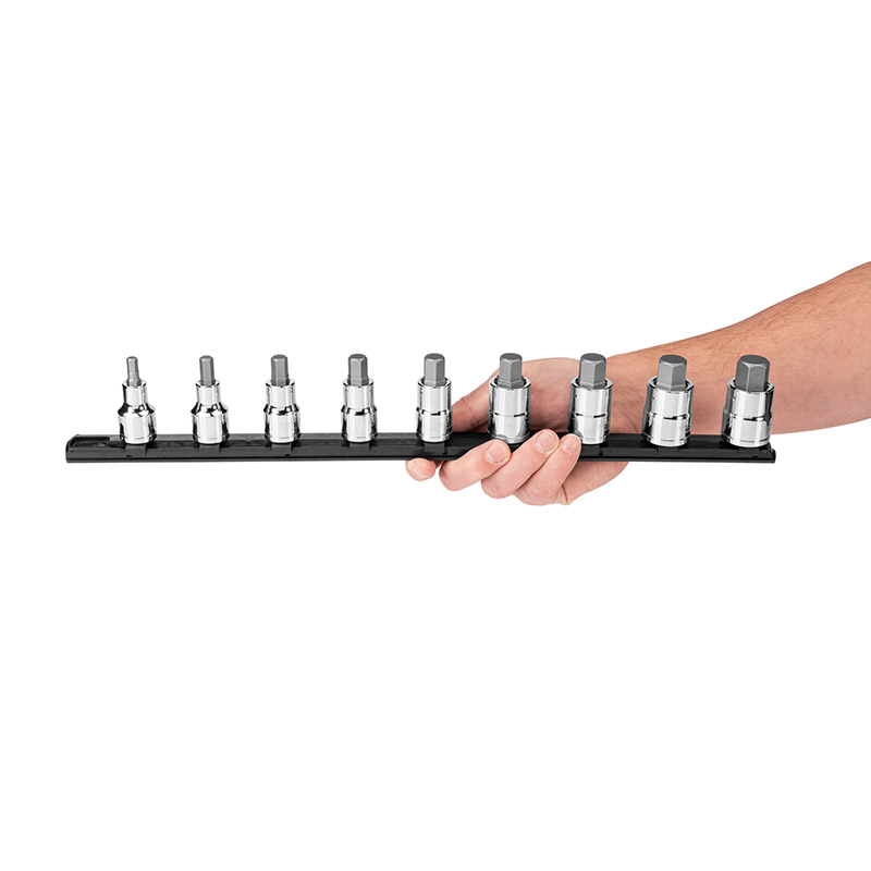 Strong, Precise Hex Bits - Bits are made of S2 heat-treated steel - The 6-sided hexagonal tip is machined to precise tolerances for an exact fit with hex fasteners ![]() Straight, Permanent Connection - Bits are pressed directly into the socket for a permanent connection - The carefully controlled process ensures bits are exceptionally straight - A tightly mated fit means bits will not loosen over time or under stress ![]() Large, Stamped Markings - Permanently impressed into the material by a roll-stamp die - As large as possible while still being readable along the socket's curved surface - Clearly visible size numbers with extra-deep outline ![]() Secure Drive Tool Engagement Detent grooves and beveled edges provide a smooth and secure connection with the drive tool. ![]() Socket Rail Organization - Patented twist-to-lock design securely holds sockets on the rail - Keyhole slot mounts to wall or workbench - Combine multiple socket rails with trays and other accessories ![]() |