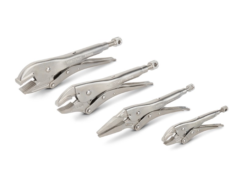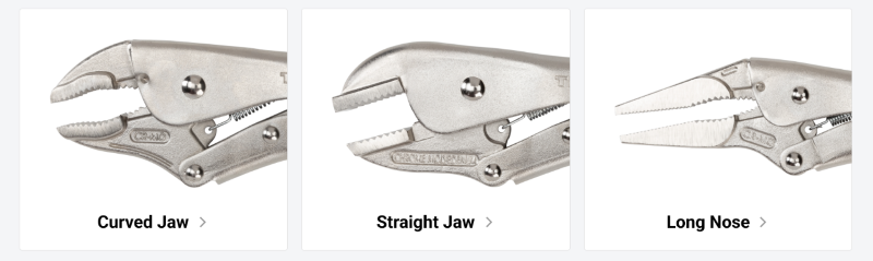 Jaw Variety![]() Pull-to-Release Lever Easily set, release, and reposition the clamp with one hand and with more control than a traditional pinch-style lever. Large Adjustment Knob The adjustment knob is knurled and round to provide grip for making adjustments even when you’re wearing gloves or have slippery hands. ![]() Tensioning Through-Hole Get extra leverage and fine-tune your clamping force by inserting a screwdriver or hex key into the through-hole to create a T-handle. ![]() High-Strength Rivets Three main rivets work together to make up the 4-point mechanical structure of the pliers and give it its strength. To make sure ours can withstand high shear forces, the rivets are made from tough 4135 chromium molybdenum steel. ![]() Strong Jaws and Teeth The jaws are made from 4140 chromium molybdenum steel, an alloy that offers toughness, machinability, and corrosion resistance. The teeth are hardened to 45-50 HRC and should not chip or strip even on fasteners up to Grade 8 or Class 12.9. ![]() Durable Nickel-Plated Finish Before assembly, the individual jaw, handle, lever, and crossbar parts are shot-peened to create smooth, consistent surfaces. The final finish is a durable nickel plating that protects against corrosion. ![]() |