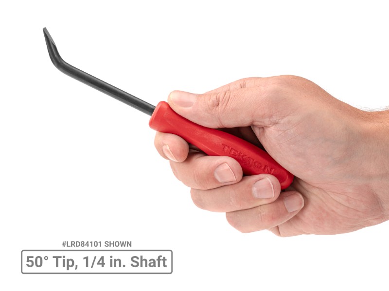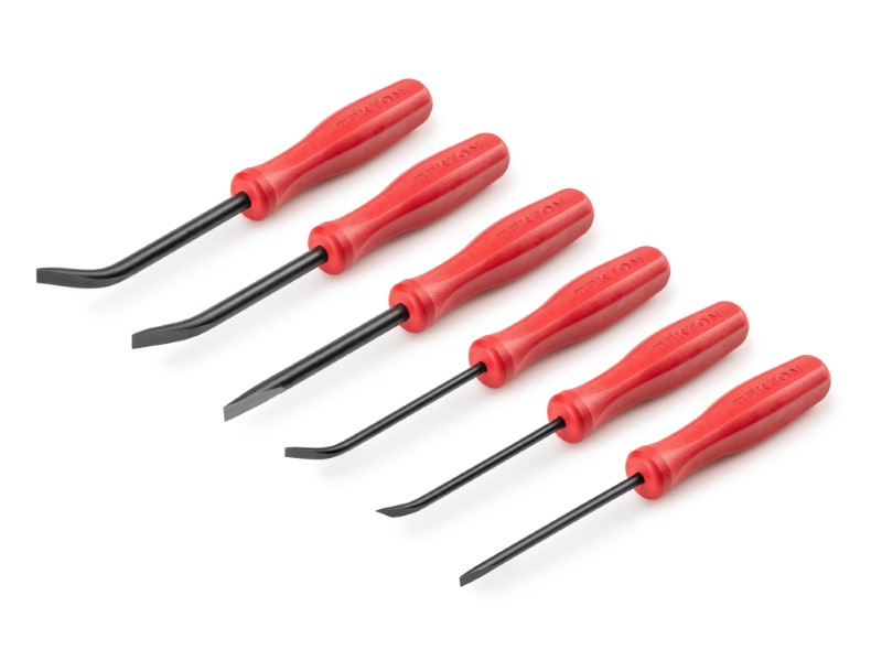 | Tekton Mini Pry Bar Set (6-Piece) Better for Prying Than a Slotted Screwdriver 30º Angled End The 30º angled end provides range of motion for prying and lifting up components, while also being able to work in tight areas.  50º Angled End The 1-inch diameter solid steel striking cap is designed to be struck by a hammer. The end of the cap directly contacts the bar stock so that any force you apply is effectively transferred through the tool.  Set Includes  Handle and Shaft Proportions The large, polypropylene handle is impact-resistant and unaffected by most fuel, solvents, and common chemicals. It’s lightly textured to provide your hands extra grip when working.  Materials and Construction The 1-inch diameter solid steel striking cap is designed to be struck by a hammer. The end of the cap directly contacts the bar stock so that any force you apply is effectively transferred through the tool.   Manufactured in Michigan Our family of mini pry bar, pick, and hook products is made entirely in Michigan with only USA-sourced materials. Machining, bending, coining, handle molding, and press-fitting the handle and blade take place at our Grand Rapids, Michigan, manufacturing facility.  |