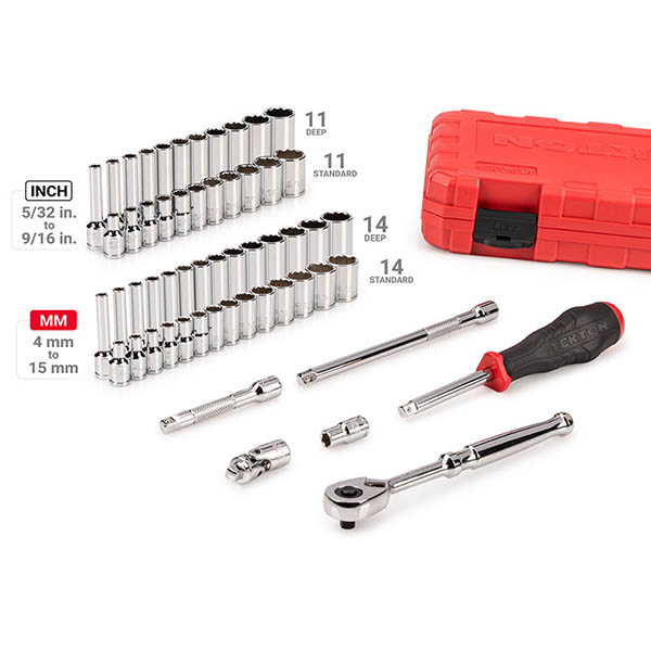 Tekton 1/4 Inch Drive 12-Point Socket and Ratchet Set with Case - 56-Piece (5/32-9/16 in., 4-15 mm)