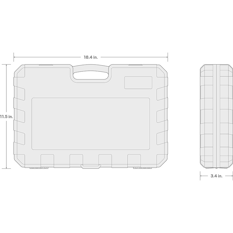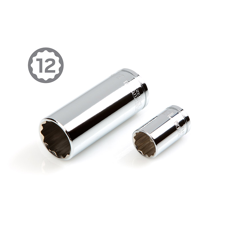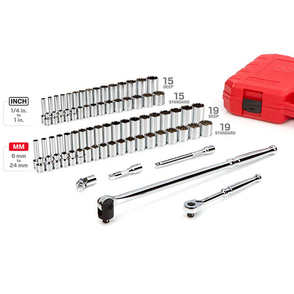 Large, Stamped Markings - Permanently impressed into the material by a roll-stamp die. - As large as possible while still being readable along the socket's curved surface - Clearly visible size numbers with extra-deep outline ![]() Fully Stepped Shoulders Narrowed diameter stretches to the base of the socket on small, deep-length sizes. This provides greater reach into tight, recessed areas. ![]() ![]() Exterior and Interior Finishes - Chrome-plated exterior is highly corrosion resistant and wipes clean to a mirror finish - Interior is protected against rust with clear coat, rather than commonly-used metallic paint ![]() 12-Point Socket Opening Get more access positions for multiple types of fasteners. ![]() ![]() Prevents Fastener Round-Off Radiused corners prevent fastener round-off by applying force to a fastener's flat sides, rather than its corners. ![]() Secure Drive Tool Engagement Detent grooves and beveled edges provide a smooth and secure connection with the drive tool. ![]() High Torque Strength Meets minimum value of 1.2 times the ANSI standard for Proof Torque. Verified by a single-cycle test that applies torque until specified value is reached without failure or permanent deformation. ![]() 90-Tooth Ratchet - 4-degree swing arc - Ultra-compact head is reduced in all dimensions - Quick-release drive locks sockets onto tang and releases with the press of a button ![]() Breaker Bar - 230-degree pivoting head without preset positions - 18 inch long handle for increased leverage ![]() Included Accessories3 and 6 Inch ExtensionsReach past obstructions and into tight spaces. Knurled band provides grip for starting or turning loosened fasteners. ![]() Universal Joint Pin-style joints rotate smoothly and continuously to access fasteners at up to 55-degree angles. ![]() Carrying Case - High-density polyethylene material withstands common lubricants, fuels, and solvents - Carrying handle, strong latches, and metal hinge pins - Molded size markings for each tool and a deep parts tray ![]() |