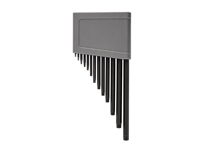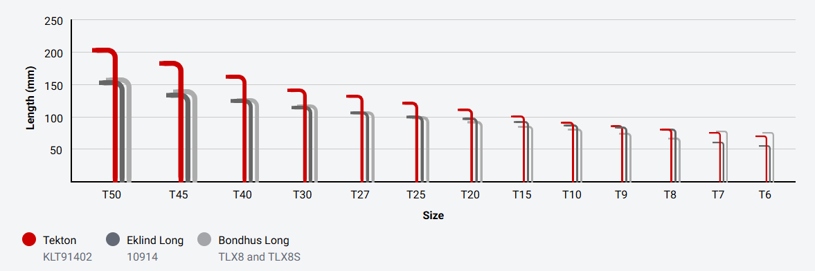 High Leverage We designed the keys to be longer to increase leverage where it matters. ![]() Precise Tip Geometry The star-shaped ends have 6-lobes that are machined to precise tolerances for an exact, high-torque fit with Torx® fasteners that resists camming out. The tips are slightly chamfered to help the keys slide easily into fasteners and reduce wear. ![]() Materials and FinishesMaximum Torque Strength We make our L-keys with 8660 nickel chromium molybdenum steel that's heat-treated to 54-58 HRC to produce tools that are hard, but not brittle. As a result, the maximum torque of the L-keys consistently exceeds the ASME standards for minimum torsion load and the ISO standards for minimum proof torque. ![]() Corrosion-Resistant Finish We coat all of our keys with a durable manganese phosphate finish that’s resistant to corrosion. ![]() Clear Markings With the exception of the smallest sizes, Tekton L-key sizes are marked in two ways—both with a high-visibility laser marking and a stamped marking. ![]() Orginization FeaturesQuick Access We designed the holder to organize the L-keys facing forward so you can easily access each tool without having to move others out of the way. ![]() Low-Profile Organization You can also face the L-keys to the side for a flat, low-profile organization solution. ![]() Self-Aligning Key Slots The slots are uniquely shaped to guide the head of each L-key into alignment with the others. Durable Material The holder provides a firm, flexible grip and resists cracking or breaking. ![]() |
