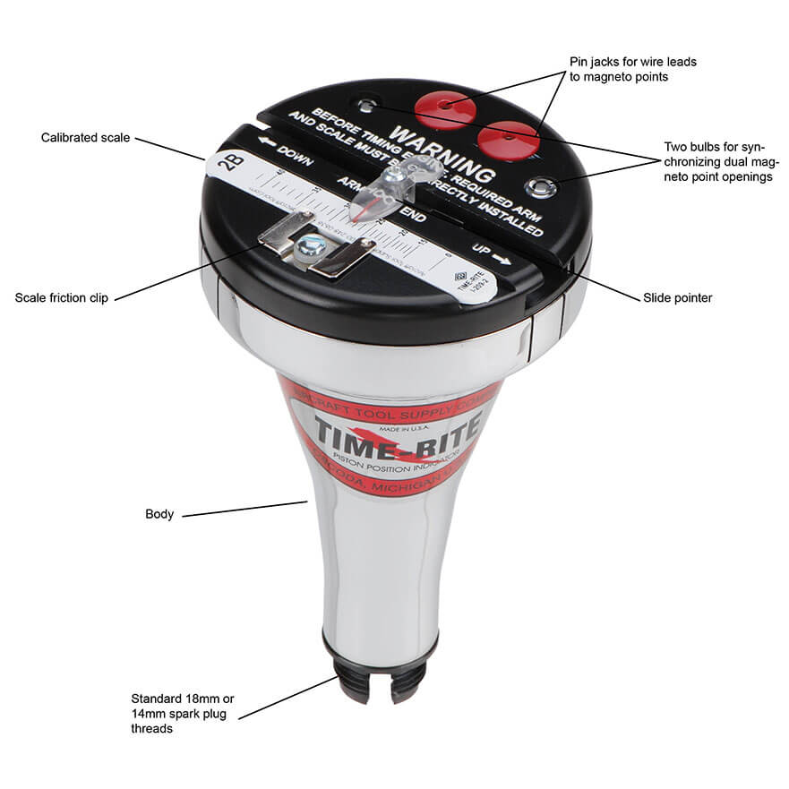 | This complete kit includes the basic unit plus the complete set of Arms and Scales required to service 14mm engines. Time-Rite is an instrument designed for precision timing of aircraft engines by direct measurement of piston travel. The features of the Time-Rite design a moveable slide pointer, and an adjustable calibrated scale, eliminate the need for finding top dead center and compensate for the variables involved in accurate piston positioning. Calibrated scales are available for most types of engines, and scale calibrations are obtained in cooperation with, and are approved by the engine manufactures. Because of the difference in spark plug locations and piston dome shapes, different pivot arms are available to adapt the Time-Rite to most aircraft engines. All arms are easily interchanged. Carries a Lifetime ATS-Pro warranty. |