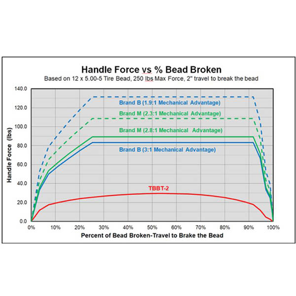 The TBBT-2 unique design leverages the power of the mechanical advantage of the clamp technology used in the Experimental Aero’s Deep Reach Dimpling Tool (DRDT-2) and makes breaking your tire bead even easier. Compared to the traditional bead breaking tools (from Brand B and M) which are adjustable for larger tires which changes their mechanical advantage, the TBBT-2 has a significantly lower operating force (2.5 to 4 times). You can even operate the TBBT-2 on your work bench. What this means is you can now break the bead without breaking your back. |