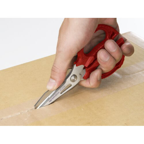 A high quality multi-use 4-in 1 innovative scissors for industrial and home use. The cutting edges are sharp and micro-serrations provide a firm grip during cutting. Super Combo Scissors™ are a uniquely designed compact yet strong cutting instrument. It incorporates four functions in one scissors: flat blade cutting, micro-serrated blade for cutting without slippage, wire cutting and box opener. The ergonomic handle is designed for comfortable non-slip grip and includes a special feature to prevent finger pinching (patent pending). The S-shape grips are designed to convey maximum applied power to the blades. |