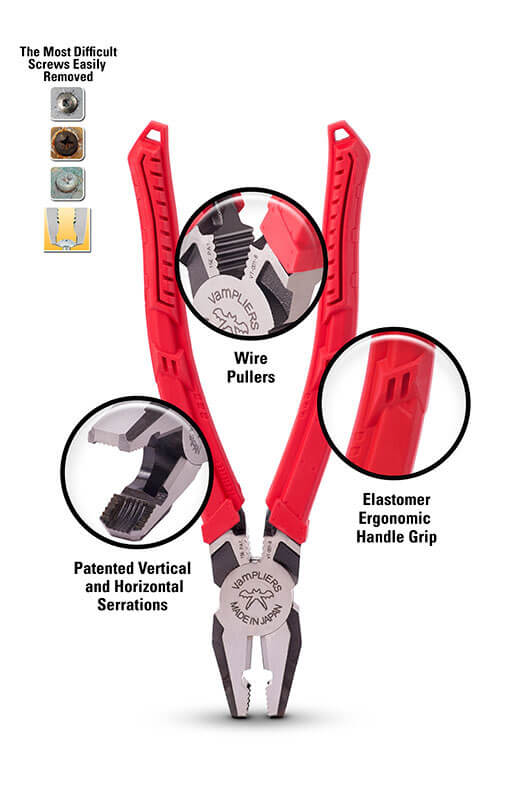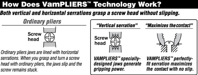 An extraordinary pair of pliers that incorporates patented and award winning VamPLIERS™ Pro Technology to solve screw extraction problems. VamPLIERS™ Pro have uniquely designed and patented concave shaped jaws with vertical and horizontal serrations on the inside jaws, which make it possible to grab on to a small stripped/rusted/corroded screw or rounded nut for extraction. VamPLIERS™ Pro will work on screws that have special, tamper-proof, or unique heads; like a Torx screw. They have smooth varnished finish and contains environmentally friendly elastomer for ergonomic grips. Manufactured in Japan, VamPLIERS are made of high quality carbon steel from Kobe, Japan. The world is held together with nuts, screws and bolts, which will need to be maintained, repaired, or replaced. Stripped, rusted, or rounded, the VamPLIERS screw remover is the perfect tool for every maintenance, repair & operation (MRO) technicians' tool box. VamPLIERS are great for professionals and D.I.Y.ers alike! |