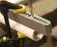 The V-Drill Guide is like a portable drill press for precision alignment. V-groove along the bottom of the guide allows for perpendicular alignment with all drill sizes on round parts and corners. Bottom surface is precision ground to assure stability and accurate perpendicular alignment on flat surfaces. Drill guide is sized for drill bit sizes: 1/8" to 3/8", and made for 17 standard drill sizes (1/8 to 3/8 in 1/64 increments). Guides are made from special nickel alloyed steel that is heat treated for durability. Drill Straight - Every Time! Drill Guide comes with a handy plastic storage case and is 100% American Made Quality. Image shows top and bottom of guide. |