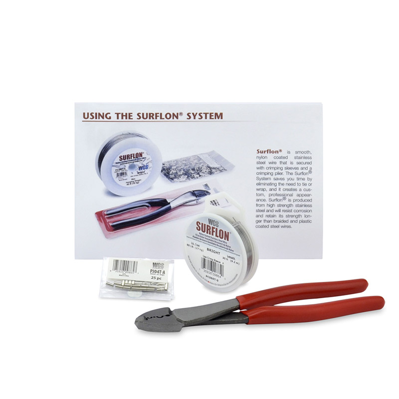 This convenient all-in-one kit features our Surflon crimping system. SurflonŽ wire is a smooth, nylon-coated stainless steel wire that is secured with specially designed Crimping Sleeves and a Crimping Pliers. The Surflon System saves you time by eliminating the need to tie or wrap, and it creates a custom, professional appearance. Surflon wire is produced from high strength stainless steel and will resist corrosion and retain its strength longer than braided and plastic coated, carbon steel wires. |