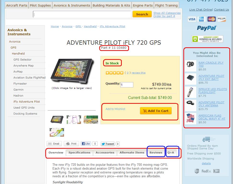 The simplest of pages is the single part page. The Add to Cart button here will move the quantity you choose into your shopping cart to order now and the add to wishlist button will save the item for ordering later. Once the item is added to your cart, a notification will popup explaining this. From here you can either continue shopping which will bring you back to the same page, or go to your cart to checkout. The tabs below the "Add to Cart" block and the photos are where the information is stored. You can cycle through these to view descriptions, features, specs, etc. The accessories tab will function differently than the old website. To order accessories, simply enter the number you want in the input box. You will see them added above in the "Add to Cart" block. Once you have the right accessories, click "add to cart" or "add to wishlist" and they will be added. There are two entirely new tabs on the site. They are "Reviews" and "Q+A". The reviews will allow you as a user to submit your feedback on the product. First rate the product on a 1 to 5 scale and then you can write in what you liked or disliked about the product. After we evaluate your review for explicit and/or false content, we will approve it and it will be posted for other users to use in decision making. The next one is "Q+A". You can use this tab to ask our product support specialists questions about the product. Once we find the suitable answer, you will receive an email and the question and answer will be posted to the website to assist future customers. Stock status is available on the product page as well as "Also Bought" items on the right side of the screen. These items are related products that previous customers have purchased with the item. See the screen shots below for examples.
