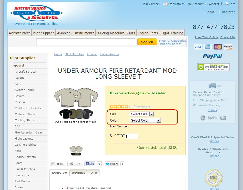 The dropdown style page is very similar to the single part page. The only different here is that you need to use the dropdown icons to select the model, size, color, etc. The functionality of the tabs remains the same. You can see in the example below how the "Add to Cart" box will look before and after a selection has been made.