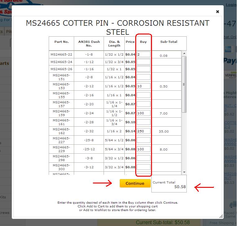 The last type of product page is the multiple part grid style page. This type of page is used when there is a large number of parts on one page that need to listed by description, specifications, sizes, etc. Examples of these would be hardware, metal, wood, engine parts, etc. The tab structure of information will be the same as the other pages. The difference here is to order, you first click the "Click to Order" button. This will pop up the window in which the parts will be listed. Type in the quantities you desire in the input boxes, usually found under the "Buy" column of the chart. Once you have made all your selections, click continue and you will see a temporary cart built with the products you selected. Once you have confirmed these are correct, click "Add to Cart" to move them to your shopping cart, or click "Add to Wishlist" to save them for ordering later. See the example below for all three steps illustrated.