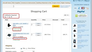 We have added the ability to checkout using Paypal. At the shopping cart screen, just click the checkout with Paypal button and you will be redirected to the Paypal website where you can make your payment. You will then be returned to the Aircraft Spruce website to complete your order. |