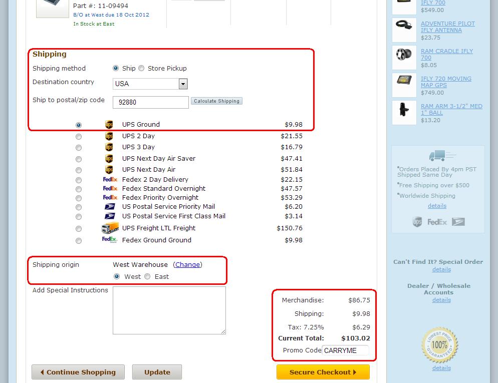 The shopping cart has also been redesigned. The general layout of parts is the same, but there is much more information incorporated into the new cart. First new feature is the ability to add manufacturer certs or 8130 forms to your items. If you click the "Yes" field above the cart where it asks "Certification Required?", you will see each item in your cart has new options. You can add these documents on a line by line basis by clicking the input boxes. Also, stock of both warehouses is visible under each line item in your cart. The information is based on the quantity in your cart. For example, if the item says In Stock at West and In Stock at East, it means our available stock at both warehouses will cover your order. In this case, the order will ship from the closest geographical location. However, some items may not be in stock at both and we only have sufficient stock at one warehouse or the other. This valuable piece of information can help you determine which warehouse you would like us to ship your order from. Later in the shopping cart you can choose where you want your order shipped from. See the illustrated example on the screen shot below. Next, you will choose your preferred shipping method. Select your country, then enter your postal or zip code and we will display all of your shipment options. This allows you to get an accurate freight quote before the checkout process begins. Keep in mind that if you change your shipment destination later from what we quoted in the cart, your shipping charges may change as well. The actual shipping charges will be apparent at order submission, once you've given us the complete destination address. We will default the shipment from the closest geographical warehouse to the country and zip/postal provided. If you wish to change the shipping origin, simply click the "Change" link and you can toggle back and forth between warehouses. Keep in mind that freight charges may vary if you switch away from the nearest geographical warehouse. The last portion of the cart has an input box for special instructions, as well a summary of your order totals including merchandise, shipping and tax. There is also entry box to input promo codes should you have any valid promo code to use. Once you are ready to proceed, click the "Secure Checkout" button to begin the checkout process.