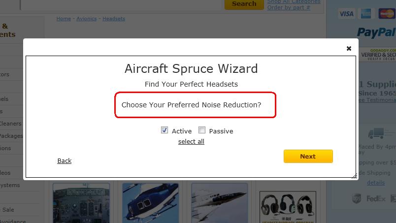 Another new feature that we have added is the Product Wizard. The idea is to help guide you into the correct products by asking you a series of questions. We will use the headset wizard as our example. The first question asked will be which brands of headsets you are interested in. If you are unsure, simply click the "Select All" link. Next, you will be asked to about what your spending limit is. These are listed in an "Up to" format, e.g. "Up to $200", "Up to $500", etc. If you are unsure, just click "No Preference". After that we will ask questions about the product. These will vary wizard by wizard. In the headset example you will be asked if you want passive or active and what plug type you will use. Keep in mind that you can always click "Select All" if you are unsure and if there aren't any matches for the selections you've made, those options will be made unavailable. Once you have gone through all the questions, your results will be presented for you to shop and make a choice. If you would like to start over, you can always click the "modify selections" link at the top of the results. We are hoping to build out our index of product wizards so that we can help you shop in a variety of categories. For a listing of our current product wizards, click here.