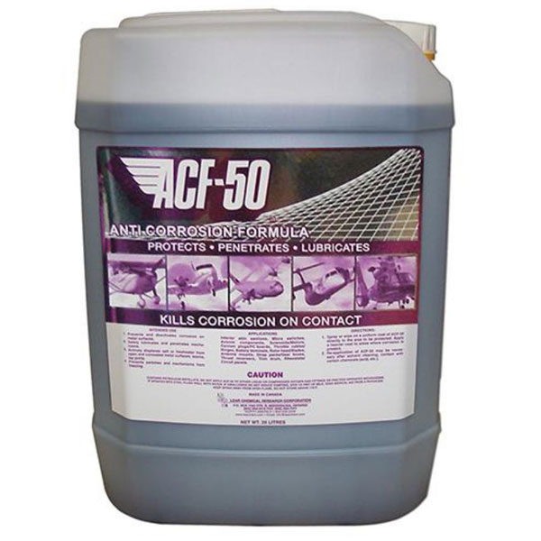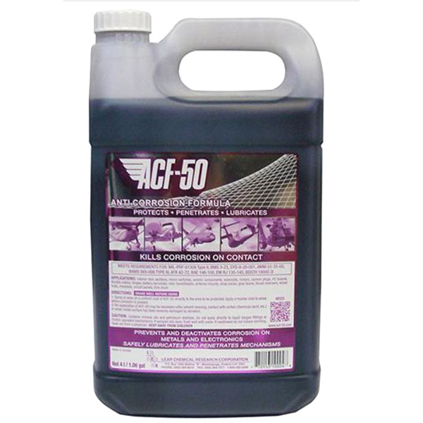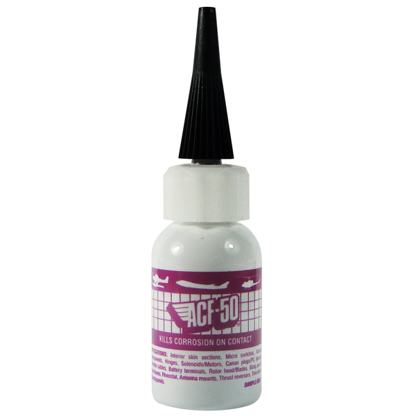 ACF-50 kills the corrosion process with just one application and will last for 24 months. Microswitches, cannon plugs, and relays will remain corrosion free. Plus, ACF-50 will easily free seized nuts, screws and bolts. ACF-50 is qualified under Mil-C-81309E, and manufactured under ISO 9000 Certified Processes. ACF-50 holds written OEM approvals from: Gulfstream, Bombardier, ATR Regional Transport, Douglas/Boeing Helicopter, Bell/Textron, Robinson, Enstrom, Sikorsky, MD Helicopters, Schweitzer, Hiller, British Aerospace, Concorde Battery, Raytheon, Piper, Cessna, Pilatus, Beech, Van's, Extra, Air Tractor, Lake, Rolls-Royce, Britten-Norman, Learjet, McDonnell Douglas, and Canadair. Try ACF-50. You will truly be amazed at the results!