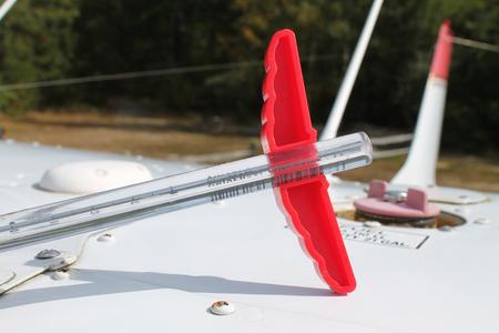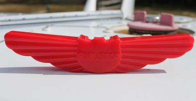 It also becomes extremely handy when it's necessary to set the gauge on the wing, as it will stay put and not roll off to disappear into the grass or onto the pavement. The Fuel Stop can be kept separately in your pilot bag to quickly snap onto a gauge that comes with a rental aircraft, or kept permanently installed in your own aircraft for regular use. The Fuel Stop is also shaped like a set of red pilot wings which makes finding the gauge in your pilot bag or aircraft seat pocket a snap.