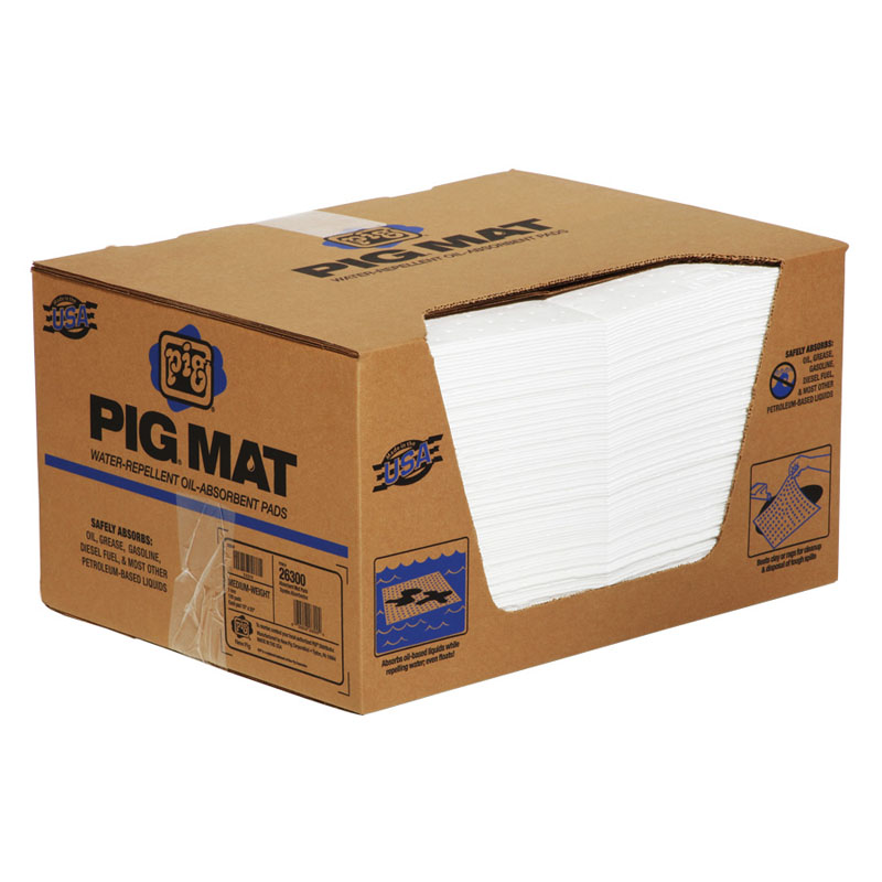 | Clean up oil-based spills without wasting absorbency on water. Unlike rags or floor sweep, PIG® Water-Repellent Oil-Absorbent Mat quickly soaks up gas and oil but repels water from rain, slush, washdowns, ponds and sumps and more! |