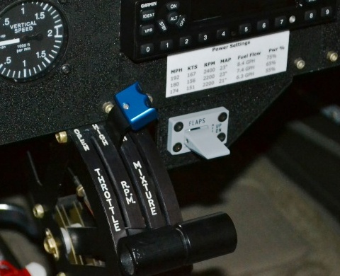 This flap handle is a well built, durable, and cost effective alternative to the plain round standard flap toggle switch that exists in most aircraft. This unit is very easily installed without removal of the toggle or any rewiring. In addition, one very important consideration was that most toggle switches have a knob that “rotates.” Attaching a flap handle to this knob looks great, but we recognized that some people would want a knob that didn’t rotate. This led to design the anti rotation plate that limits knob rotation and also provides a nice labeling of the flap handle. To finish it off, the components are powdercoated and include all necessary installation hardware. (Black non metallic AN screws are provided to match the black set screws.