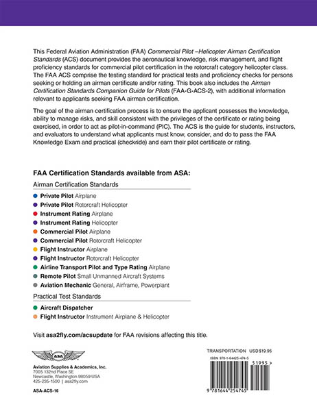 | This Federal Aviation Administration (FAA) Commercial Pilot Helicopter Airman Certification Standards softcover book (ACS-16) supersedes the Practical Test Standards (8081-16B), and is the guide for students, instructors, and evaluators to understand what applicants must know, do, and consider to pass their FAA Knowledge Exam and practical (checkride) and earn their commercial helicopter pilot certificate in the rotorcraft category, helicopter class. This ACS includes the aeronautical knowledge, risk management, and flight proficiency standards necessary for certification, ACS codes, and the Companion Guide (FAA-G-ACS-2). |