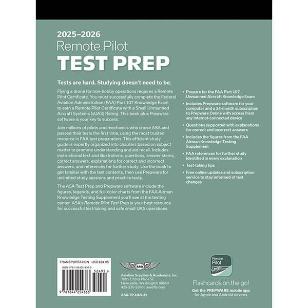 This product includes a digital code to activate prepware, delivered to your account immediately upon purchase, and a softcover book to be shipped to you. Flying a drone for non-hobby operations requires a Remote Pilot Certificate. You must successfully complete the Federal Aviation Administration (FAA) Part 107 Knowledge Exam to earn a Remote Pilot Certificate with a Small Unmanned Aircraft Systems (sUAS) Rating. This softcover book with Prepware software is your key to success. Join millions of pilots and mechanics who chose ASA and passed their tests the first time, using the most trusted resource in FAA test preparation. This efficient study guide is expertly organized into chapters based on subject matter to promote understanding and aid recall. Includes instructional text and illustrations, questions, answer stems, correct answers, explanations for correct and incorrect answers, and references for further study. Use the book to get familiar with the test contents, then use Prepware for unlimited study sessions and practice tests. The ASA Test Prep and Prepware software include the figures, legends, and full-color charts from the FAA Airman Knowledge Testing Supplement you’ll see at the testing center. ASA’s Remote Pilot Test Prep is your best resource for successful test-taking and safe small UAS operations.
