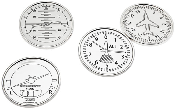This nickel-plated airplane coaster set looks like it came directly off of an actual instrument panel! There is an altimeter, attitude indicator, directional gyro, and turn & slip indicator to set your next beverage on! The felt backing keeps your furniture protected and prevents your drink from sliding away. |